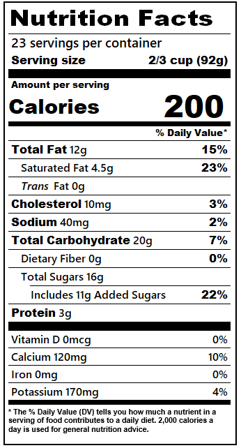 WATER, ANHYDROUS MILK FAT, SKIM MILK POWDER, SUGAR, CORN SYRUP SOLIDS, PASTEURIZED EGGS, NATURAL & ARTIFICIAL FLAVOURS, STABILIZER/EMULSIFIER (MONO- AND DIGLYCERIDES, GUAR GUM, CELLULOSE GUM & CARRAGEENAN STANDARDIZED WITH DEXTROSE).